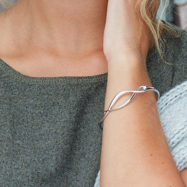 Entwining silver is the perfect adornment for any wrist. The hinged hook fastening makes for ease of wear.