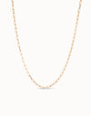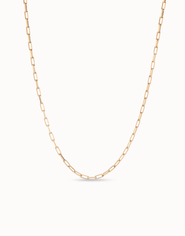 Long unisex 18K gold-plated chain with narrow and elongated links. A jewel that can be worn alone or with charms. Jewel made in Spain under a 100% handcrafted process, with a unique and unmistakable design of UNOde50©.