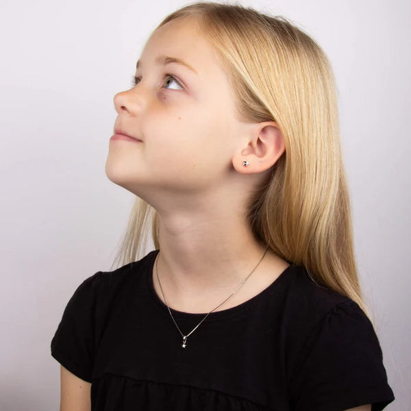 This stunning star shaped pendant, set with a single sparkling diamond, is a classic profile loved by all. This beautiful piece of children's jewellery is one of our best selling pieces and it is perfect as a christening keepsake or a beautiful first diamond gift. Crafted in recycled sterling silver with a platinum plating, this necklace features a chain length of 35.5cm and is sure to be a firm favourite in your little one's jewellery collection.