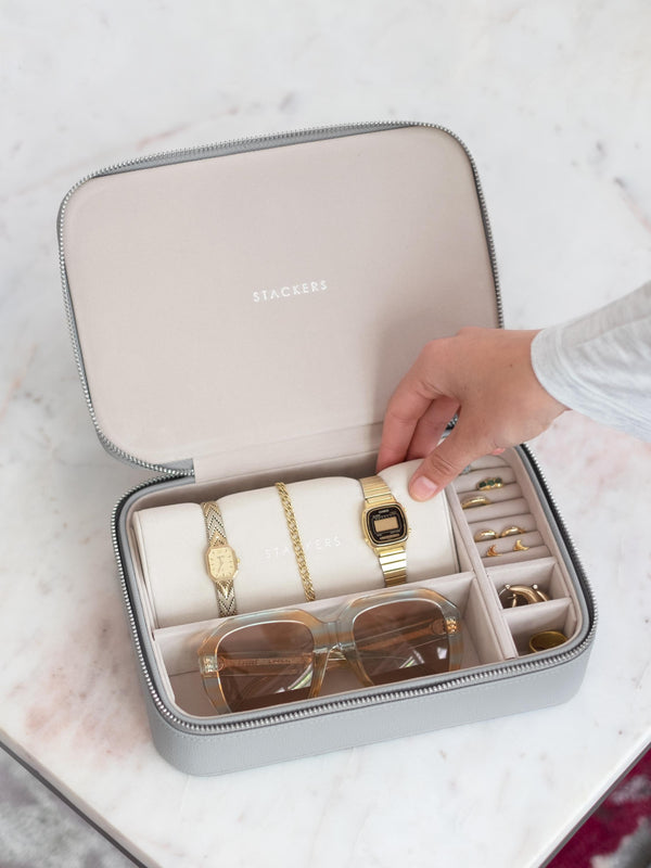 Stay organised with the Stackers Jewellery & Accessories Box. Keeping your watch and bracelets safe with the removable watch pad, with enough room for your sunnies too! The ring roll is perfect for extra rings or stud earrings and there’s additional compartments for your smaller accessories. Everything you need to stay organised at home or on-the-go.