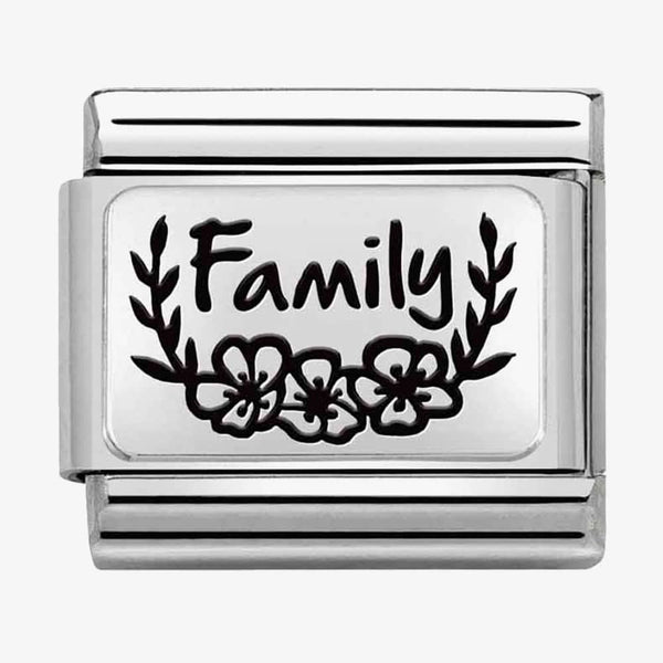 Original Nomination Link for Composable Classic Bracelets in stainless steel and sterling silver with FAMILY with flowers text and symbol in Black engraving. Made in Italy. A family is defined by unconditional love and support, celebrate everyone you consider family with this Link.