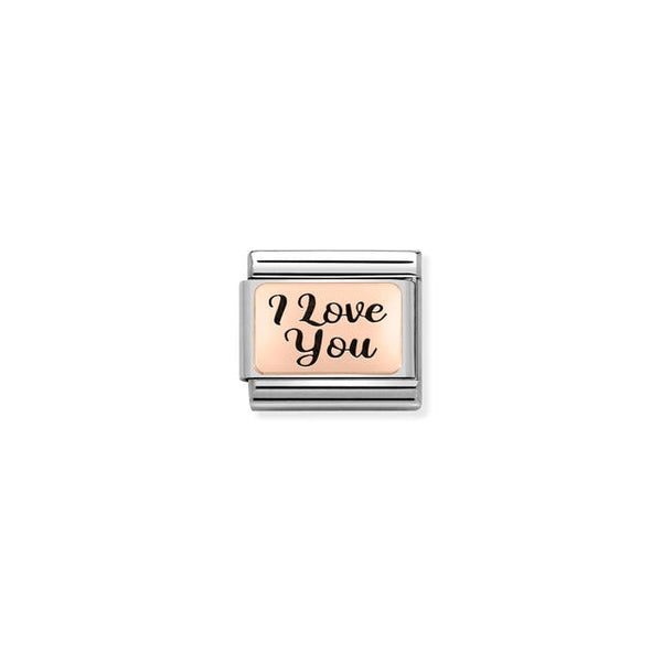 Original Nomination Classic Link in stainless steel and rose gold with text I LOVE YOU. Made in Italy. The perfect Link to add to your bracelet to capture the deepest of sentiments.