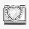 Original Nomination Classic Link in stainless steel with raised Faceted White Heart with Beaded setting in sterling silver. The fancy beaded setting of the heart add a touch of delicate style to this Link that is both classic and contemporary at the same time. Play with light by adding this faceted heart and other Links with stones to your Composable bracelet.